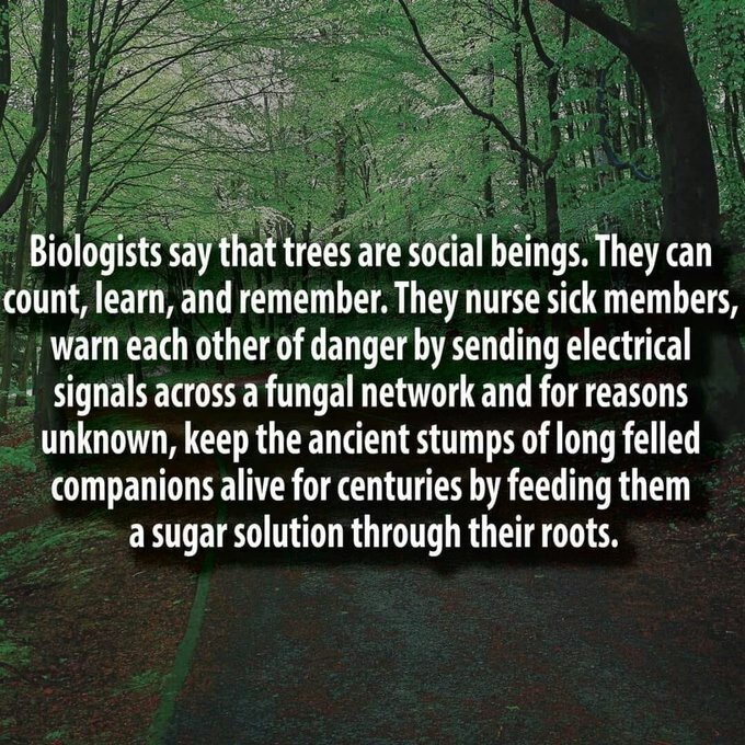 Bäume sind soziale Lebewesen. Sie können zählen, lernen und sich erinnern. Sie kümmern sich um kranke Artgenossen und warnen sich bei Gefahren mittels elektrischer Signale über ein Pilznetzwerk über die Wurzeln. Aus unbekannten Gründen halten sie die Stümpfe lange gefällter Begleiter über Jahrhunderte am Leben, indem sie sie über die Wurzeln mit einer Nährlösung versorgen.