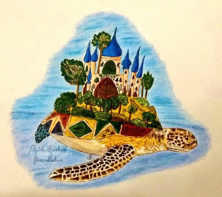 Interessant. Ich weiß, dass es die Bücher gibt, hab sie aber nicht gelesen. Inspiration war hier eine in vielen Kulturen und unter vielen Namen bekannte riesengroße Seeschildkröte, die oft für eine Insel gehalten wird. Das Schloß hab ich dazu gedichtet.