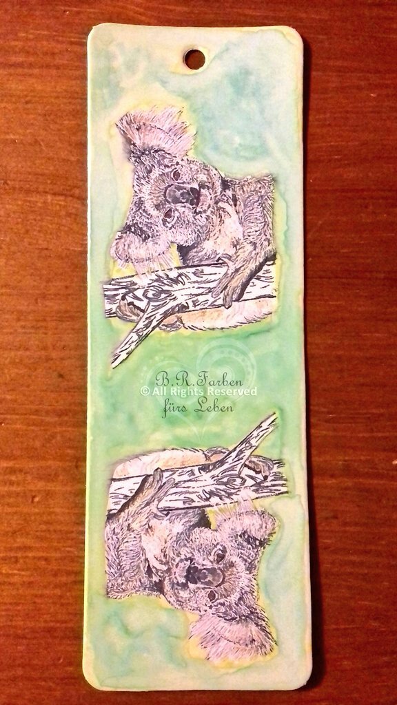 Bereits vorhandenen Motive sind ab sofort auch auf Lesezeichen gedruckt zu haben. Hier der Koala mit hangemaltem Aquarell Hintergrund.