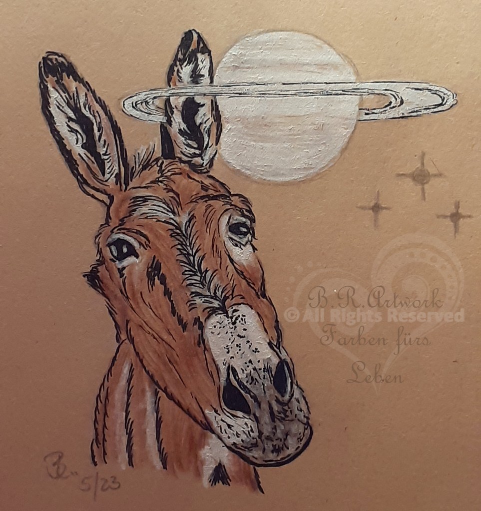 Esel mit Saturn A6 Fineliner, Brushpen und weißer Gelstift